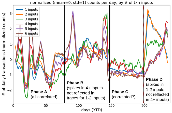 It appears that the entity's transactions were mostly 1in/2out and 2in/2out, with a lesser number of 3in/2out.