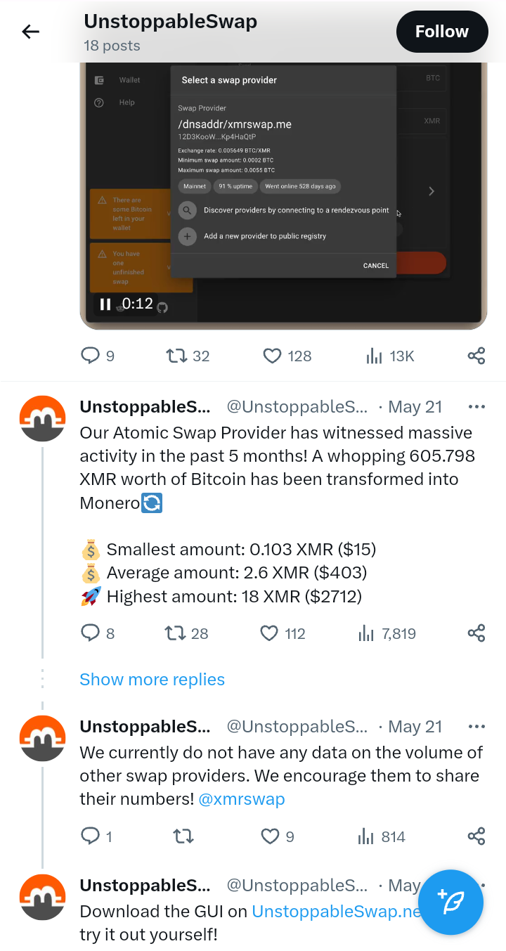 <plowsof:matrix.org> #unstoppableswap:matrix.org room , (1 other swap provider shares stats sometimes also.. let me check)