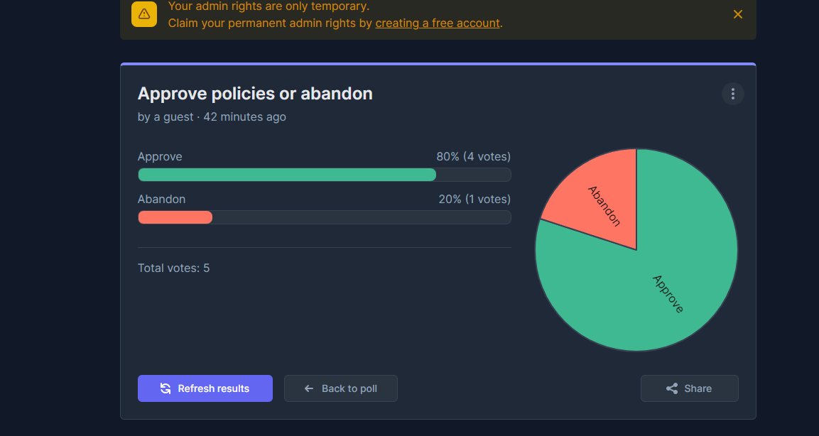 <comradeblin:matrix.org> strawpoll does not give out ips. I created the poll, I only see the results, noones ip/name / name of their pet fish is shown