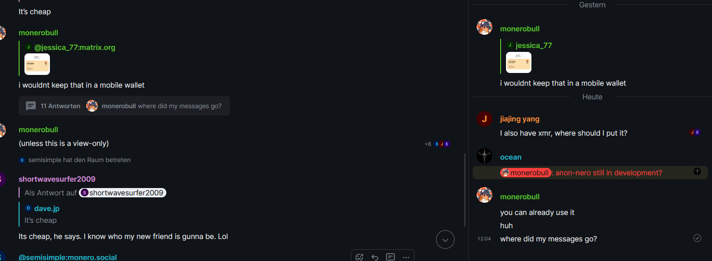 <xmrscott:monero.social> No need to apologize; shouldn't be an expectation for a 24/7 online presence to engage in a conversation right as it happens. Matrixorg's application firewall induced latency is a mess anyways and I've seen within my client a striped pattern of Today | Yesterday | Today | Yesterday | Today timestamps which makes following conversations less than ideal