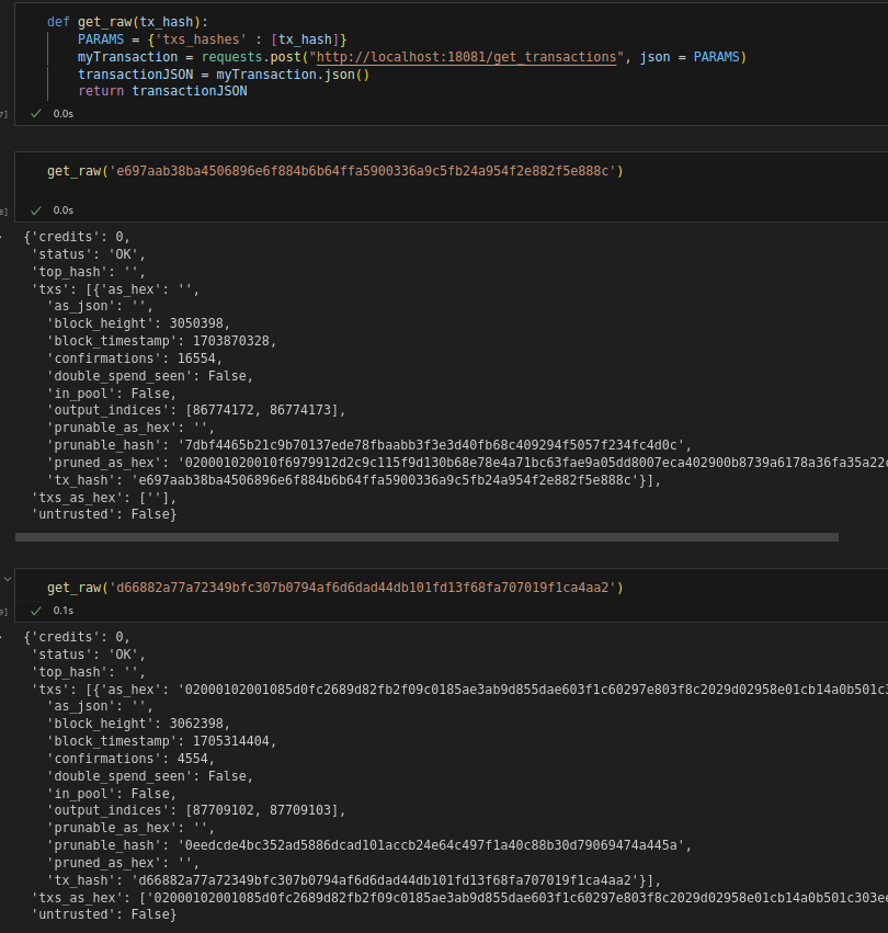 m-relay<drghost:matrix.org> e.g. if I call monerod RPC /get_transactions on a recent tx it gives me the tx 'as_hex' but if I call a 3 week old transaction it only gives me pruned_as_hex and I can't get the full transaction as_hex