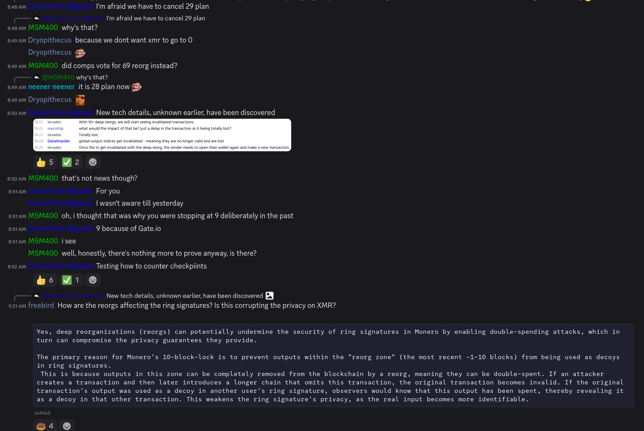 <bawdyanarchist:matrix.org> In alot of ways I agree with you, that Eth checkpointing is more decentralized. But I dont think it's a PR move that Monero can afford to make.