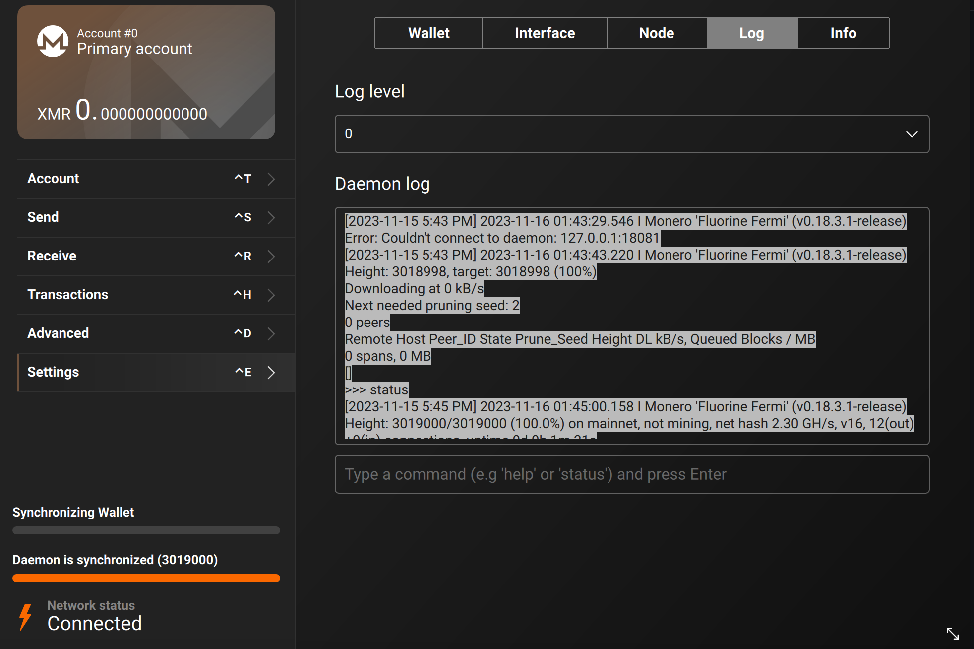 <crabwalk:matrix.org> Height: 3019000/3019000 (100.0%) on mainnet, not mining, net hash 2.30 GH/s, v16, 12(out)+0(in) connections, uptime 0d 0h 1m 21s