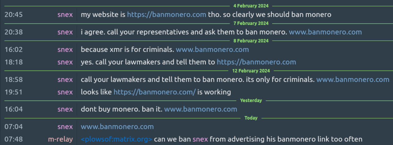 <plowsof:matrix.org> can we ban snex from advertising his banmonero link too often