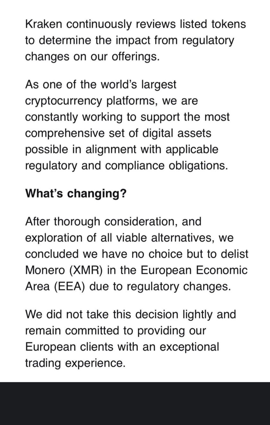 <stnby:kernal.eu> After thorough consideration, and exploration of all viable alternatives, we concluded we have no choice but to delist Monero (XMR) in the European Economic Area (EEA) due to regulatory changes.
