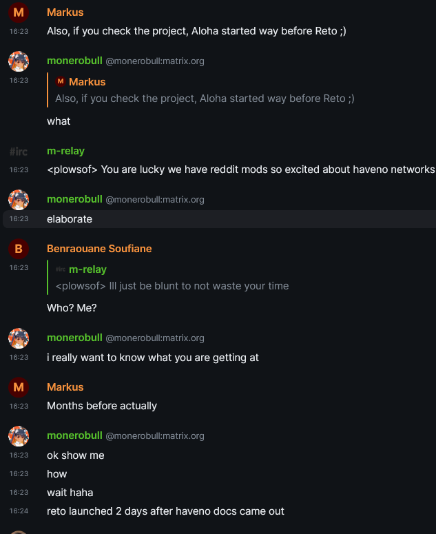<monerobull:matrix.org> he also claimed to somehow have launched "months before reto"?