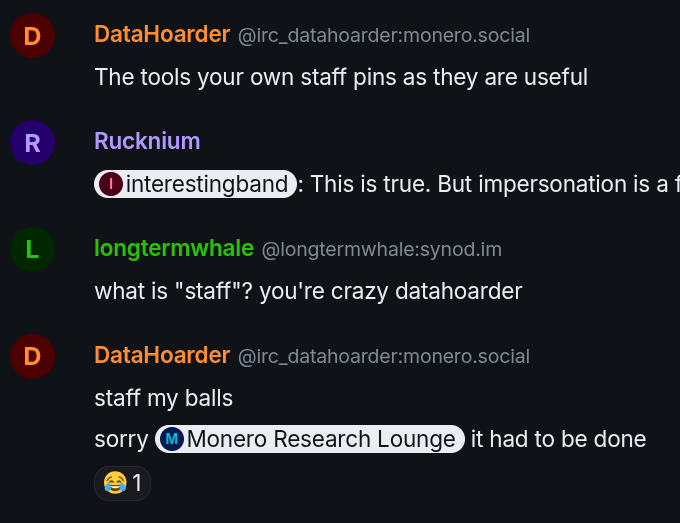 <longtermwhale:synod.im> @barthman132:matrix.org: monerobull represents the typical hardcore monero fan. they've been holding for years; they moderate the reddit; they host the monero forum; they eagerly waited for serai for years; they help out with haveno guides. monerobull is gone and sold everything. you can ignore devs leaving, scammers ruining the project, and everything else, but don't ignore monerobull leaving