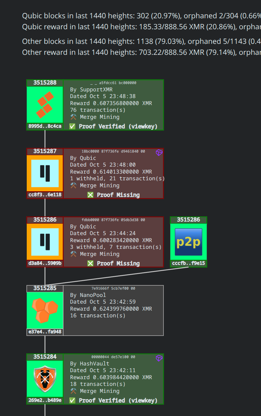 qubic has started selfish mining again and orphaned P2Pool mini block